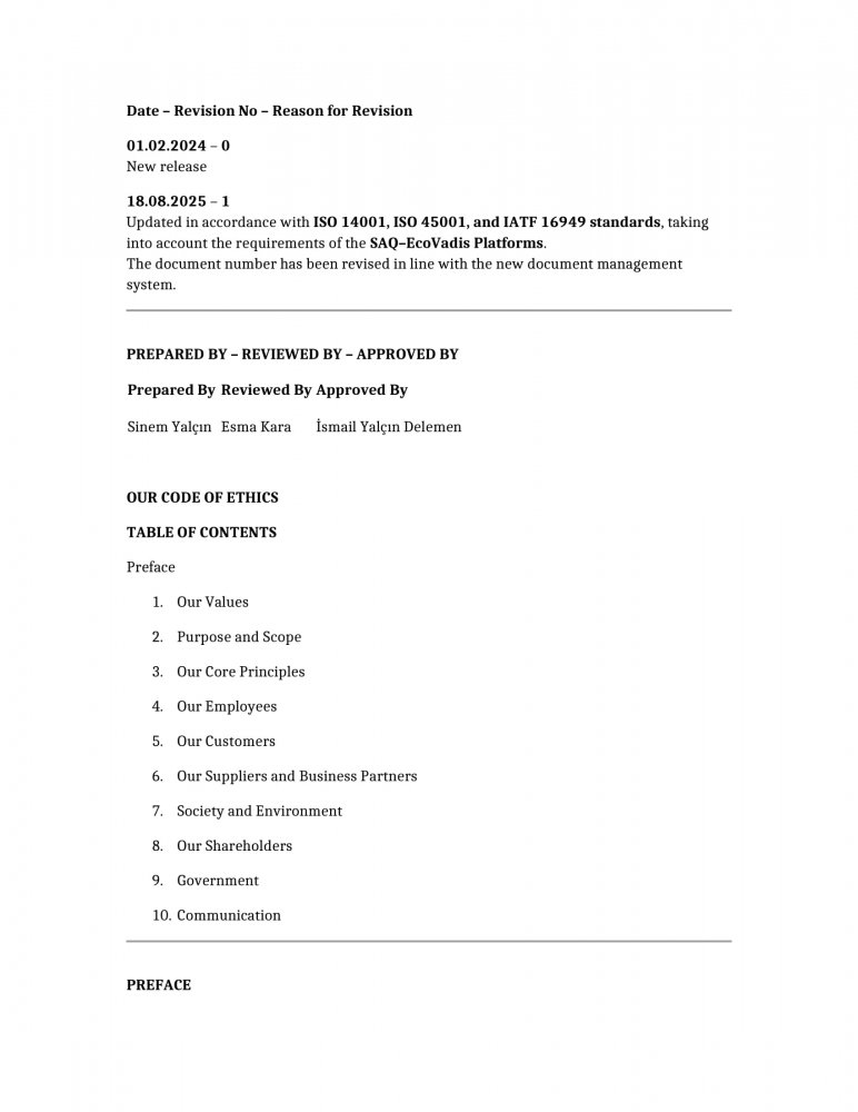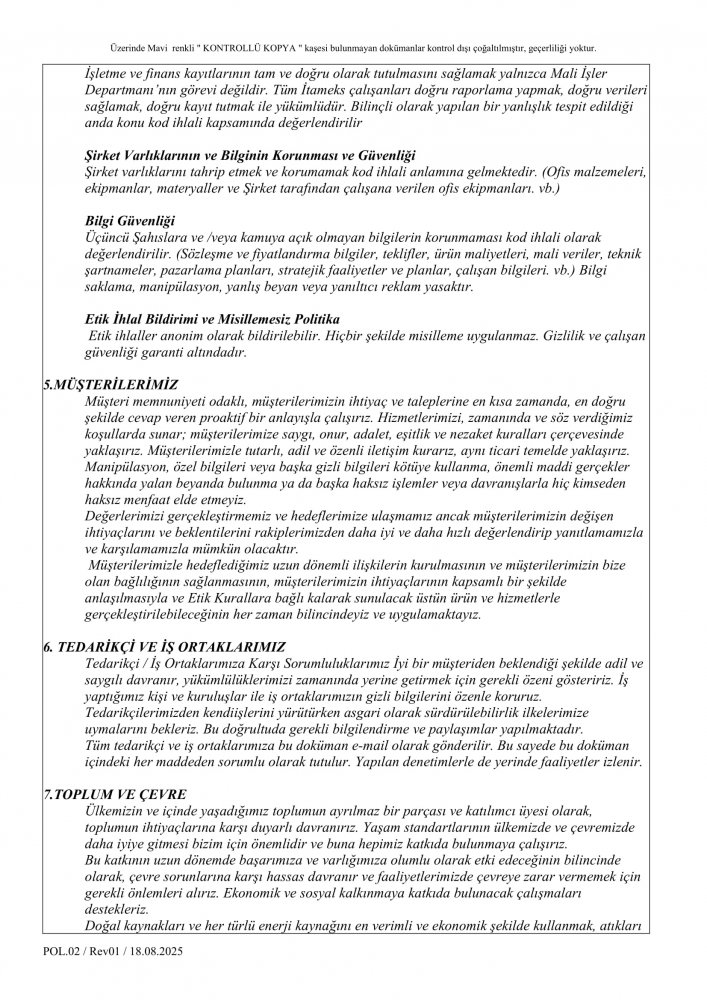 Uyumluluk ve sürekliliği sağlamak adına; Yönetim sistemleri, müşteri gereklilikleri, ilgili yasal ve düzenleyici gereklilikler ve sektörün en iyi uygulamalarıyla tam uyumu sağlayarak ürün bütünlüğünü ve operasyonel mükemmelliği koruyacağız. Sürekli İyileştirme Kültürünü Teşvik Etmek için; yenilik, iç/dış geri bildirim ve veri odaklı karar verme yoluyla entegre yönetim sistemimizi, süreçlerimizi ve ürünlerimizi sürekli geliştireceğiz.