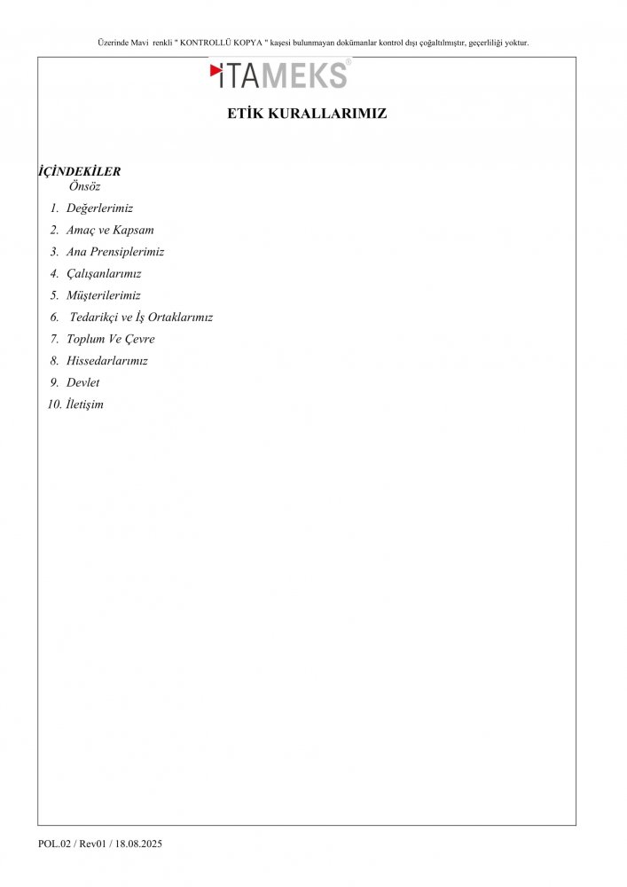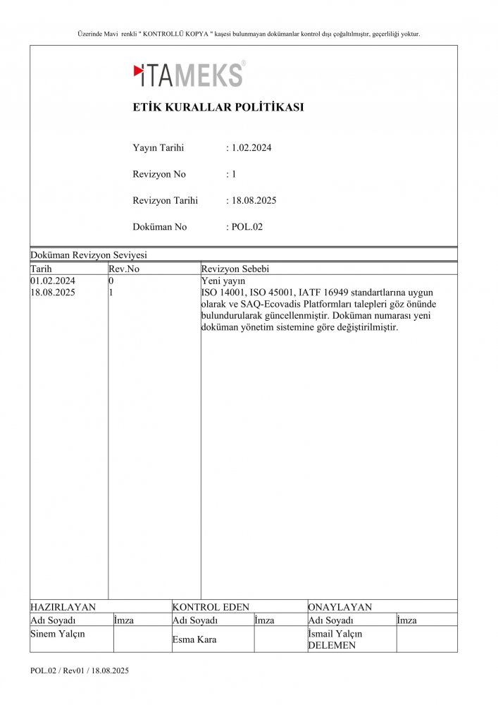 İtameks olarak, yüksek kaliteli otomotiv bileşenleri ve sistemlerinin tasarımı, üretimi ve teslimatında mükemmelliğe ulaşmaya kararlıyız. Küresel otomotiv tedarik zincirindeki kritik rolümüzün farkındayız; kalite, güvenlik ve performans açısından en yüksek standartları korumayı taahhüt ediyoruz. Kalite, güvenilirlik ve performans açısından müşteri beklentilerini karşılayan veya aşan ürün ve hizmetler sunacak, aynı zamanda belirlenen zaman çizelgelerine ve gereksinimlere uyacağız.