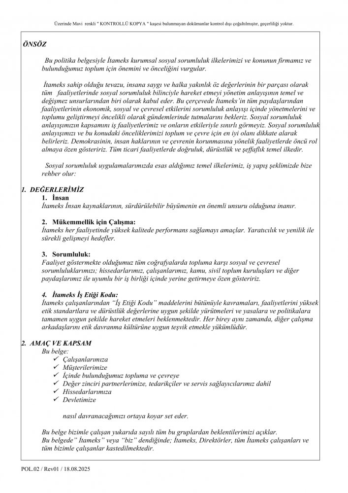 İş Sağlığı ve Güvenliği adına; çalışanlarımızın yaralanmasını ve sağlığının bozulmasını önlemek için güvenli ve sağlıklı çalışma koşullarını sağlayacağız.