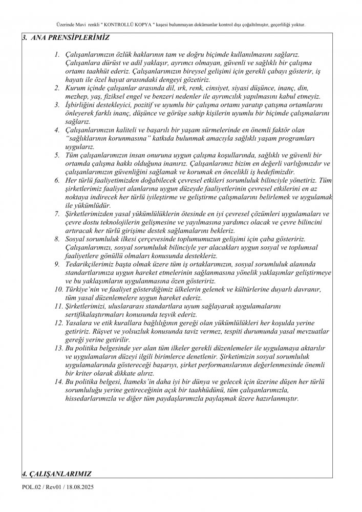 Çalışanlarımızı desteklemek ve yetkinliğini arttırmak adına; çalışan eğitimine, beceri gelişimine ve ekip çalışmasına yatırımlar yapacağız. Çalışanlarımızın süreçlerimize danışma ve aktif katılımlarını sağlayarak kalite, çevre, iş sağlığı ve güvenliği sorumluluğu bilincini artıracak bir kültür oluşturacağız.
