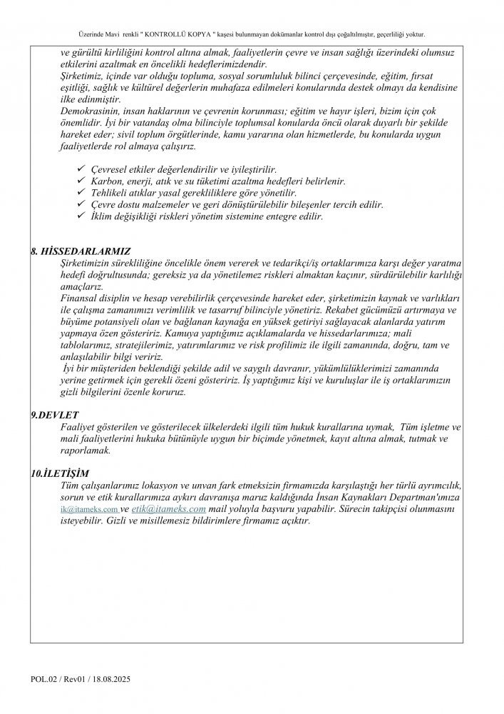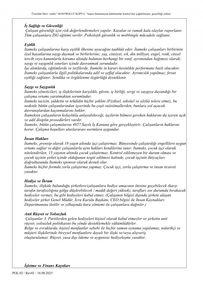 Bu Entegre Yönetim Politikası, kuruluş genelinde iletilmekte, geçerliliği ve etkinliği açısından düzenli olarak gözden geçirilmekte ve tüm paydaşlara açık tutulmaktadır. Politikamız amaçlarımızın belirlenmesi için bir çerçeve sağlamaktadır.